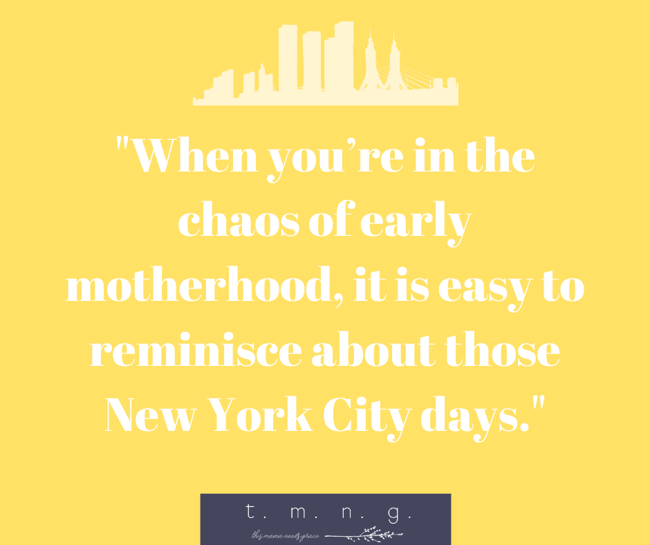 My mind goes back to New York because I can remember how I responded to the type of freedom I had back then. Now, as I have a small taste of that freedom, I can’t help but crave the limitations and the noise and the mess of my actual life. When you’re in the chaos of early motherhood, it is easy to reminisce about those New York City days. Of late night runs, of solo meals, of endless quiet time.