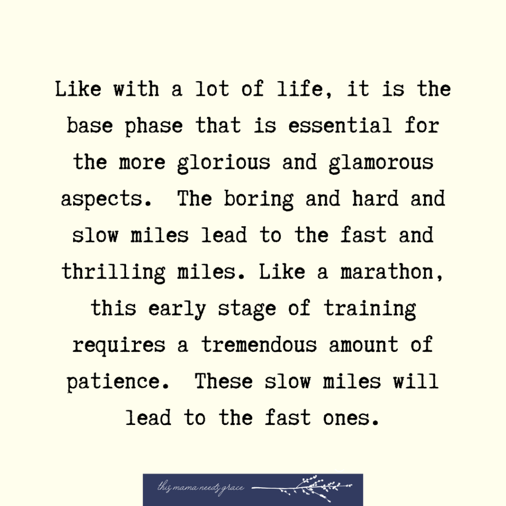 The reality of base training is that it not very fun or exciting. It is a lot of slow and painful miles. Like with a lot of life, it is the base phase that is essential for the more glorious and glamorous aspects. The boring and hard and slow miles lead to the fast and thrilling miles. Like a marathon, this early stage of training requires a tremendous amount of patience. These slow miles will lead to the fast ones. You just have to keep showing up. Keep logging those miles day in and day out. The exciting miles are on the horizon. They are coming.