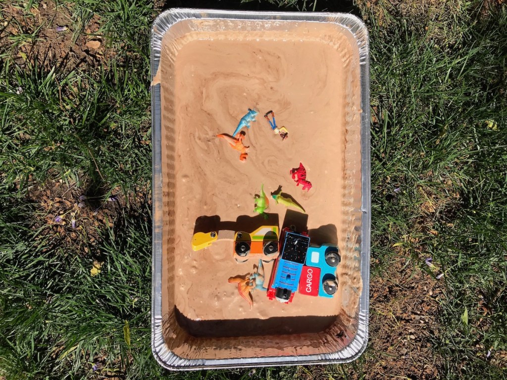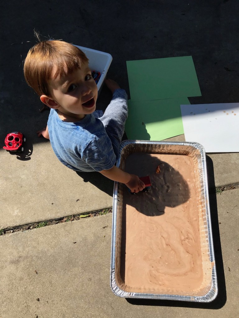 I will be honest, I have been on Pinterest more than ever recently. And it gets pretty overwhelming. I am all about simple activities with few supplies and ingredients needed. When I saw this mud play recipe, I knew it was perfect. You just combine water, flour, and cocoa powder. And there you go, the best smelling mud ever. It was perfect for creating dinosaur and truck tracks on paper.