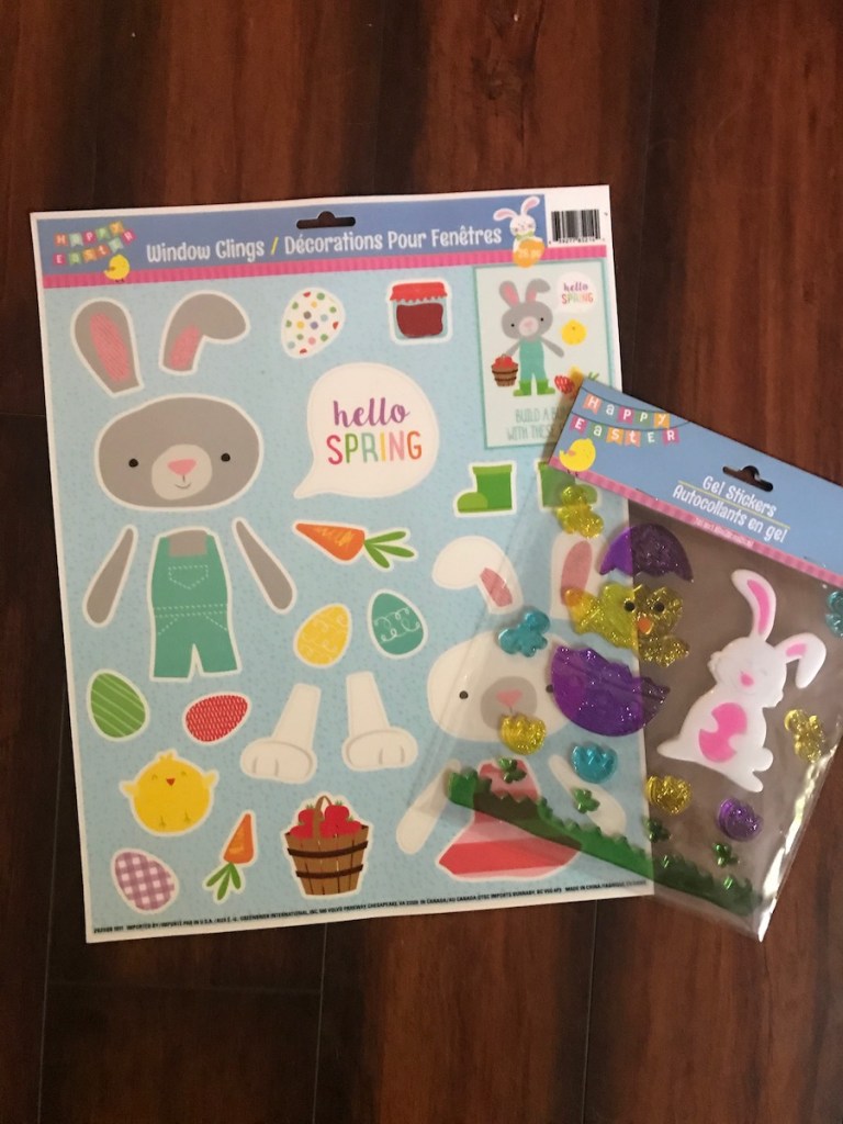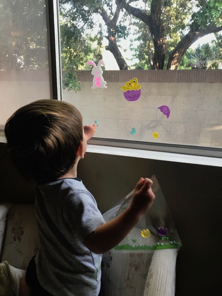 If you are able to make a quick trip to the dollar store, they have really cute Easter window clings. This was very entertaining for Hudson. He especially likes the gel clings, which I am not crazy about because it attracts dog hair and H always ends up ripping them. But it is just $1 and entertains him, so still worth it in my book. The day we brought them out, he kept going back to the window to rearrange the bunny and the chick.