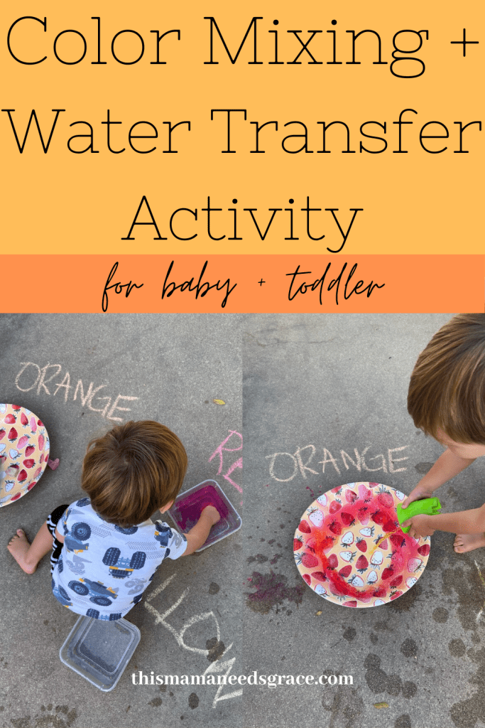 For the water activity, I simply created two containers of water: one dyed red and one dyed yellow. I let him scoop with a cup each color into a new bowl to make orange. I also put some sponges out for him to play with. With the orange water, we worked on sponge transferring water to the empty containers. So simple and a great way to show how the color orange is made.