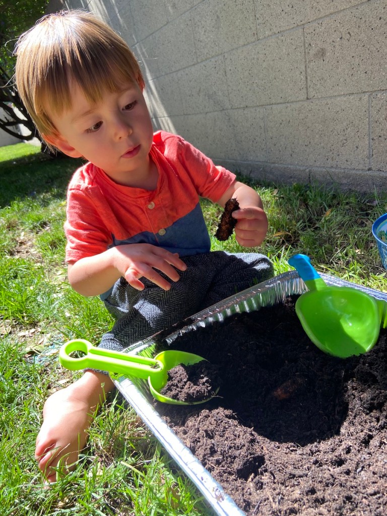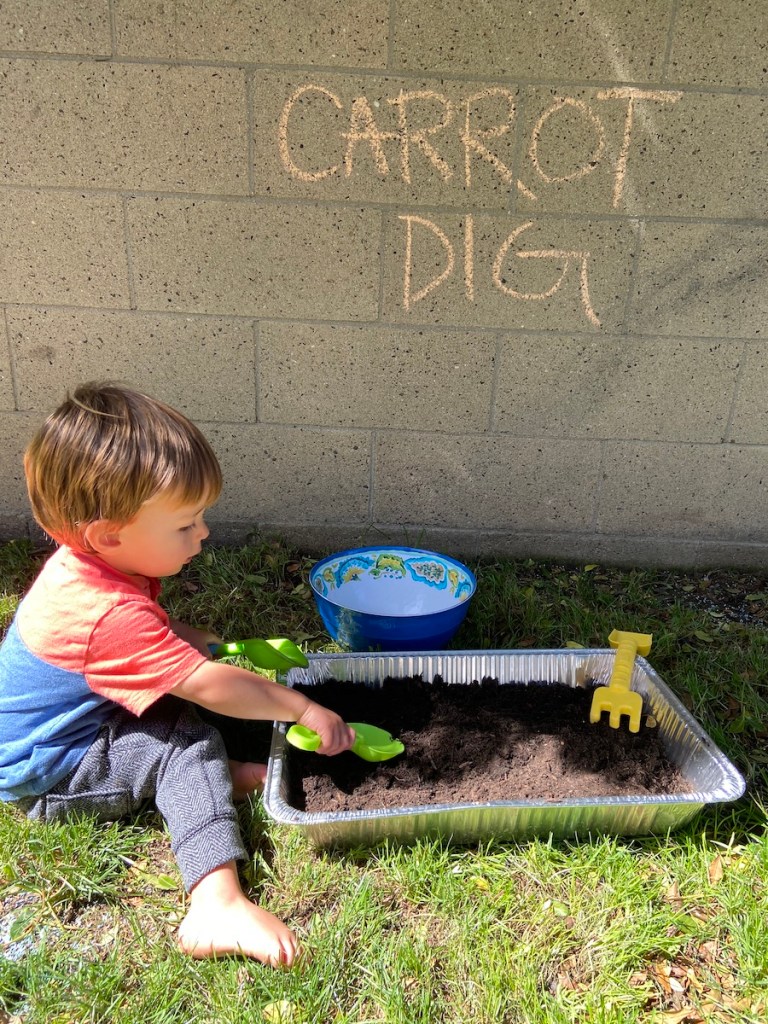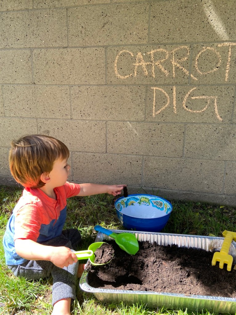 The carrot dig sensory bin setup was SO simple and was by far Hudson’s favorite activity that we did all week. All I did was pour soil into an aluminum food tray and buried about 12 carrots. Hudson is very into all things gardening, so this was the perfect activity for him. He loved shoveling the dirt and it was nice to have a more controlled area where playing with dirt and digging were acceptable. After he found all the carrots, I let him wash them with a bowl of water. The washing them part was equally as fun for him.