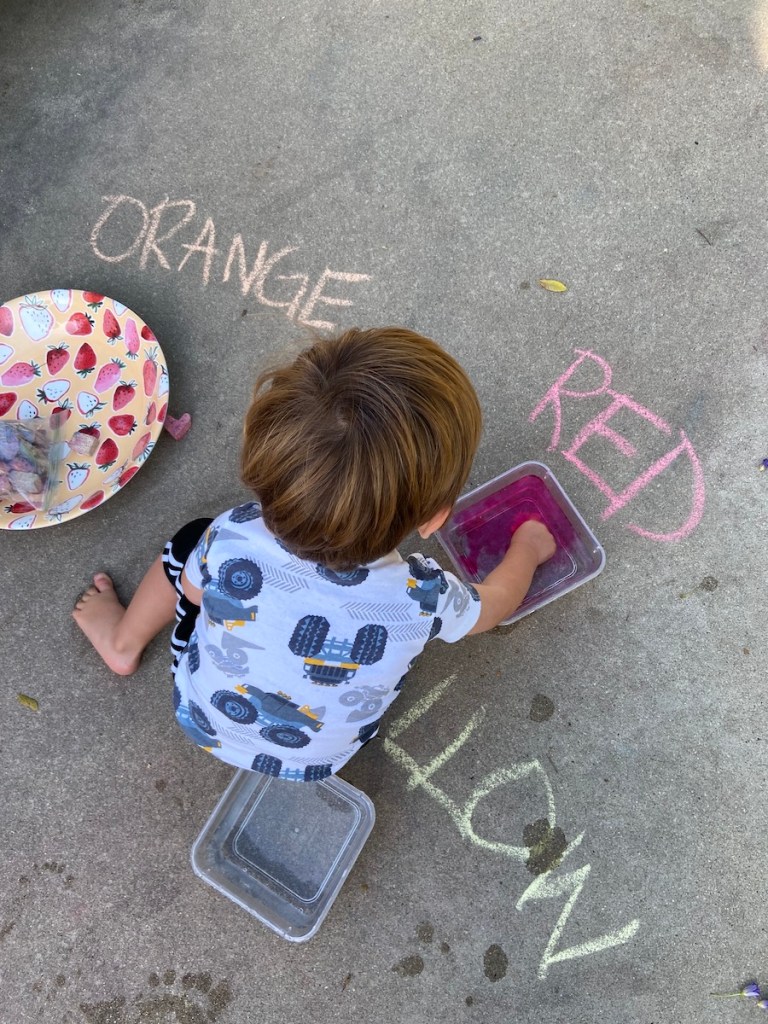 The part Hudson enjoyed the most was actually the process of creating the orange paint. I only had white paint, so we created our own by adding red and yellow dye to the paint. This is a fun way to show how colors are created. H really enjoyed adding the yellow dye and mixing it with his paintbrush.