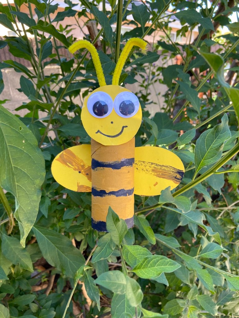 After the stripes were painted, I cut out a cicle for the head, and glued all the parts together! We glued big googly eyes on the head and I drew a nose and smile. For the antennas I cut pieces of yellow pipe cleaner and used scotch tape to attach to the back of its head.