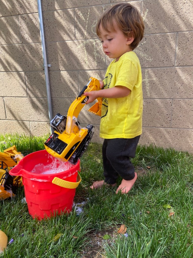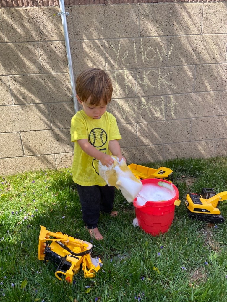 To make the activity last a bit longer, I created a “Yellow Truck Wash.” I set up a bucket with soapy water, handed him a sponge, and he loved it. Just make sure the trucks you let your little ones wash are okay with getting water on them!