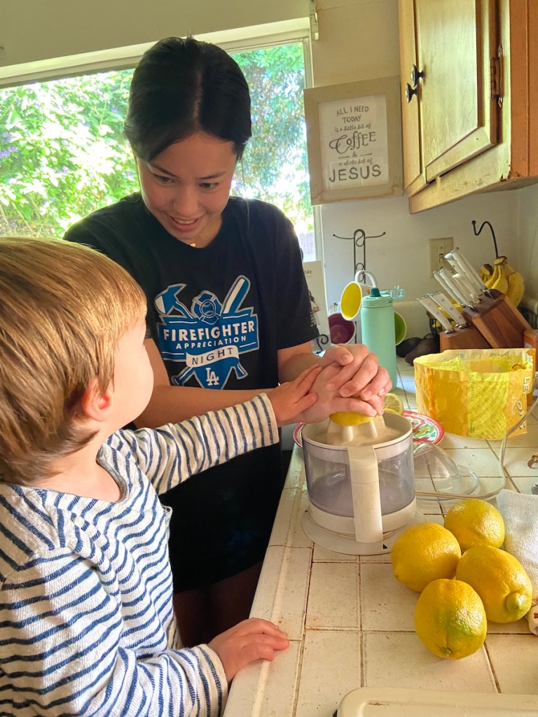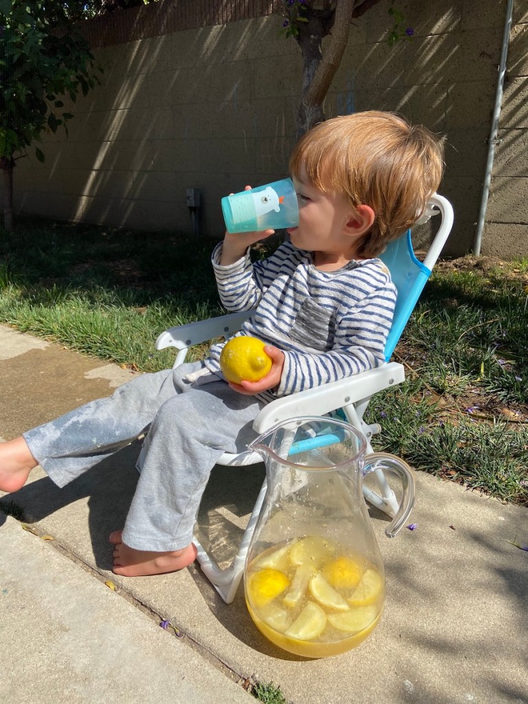 We used this lemonade recipe. We used an electric juice squeezer that made it easy for H to help squeeze the lemons. H and his auntie squeezed all the lemons together! After we made the lemonade, we enjoyed some sunshine and sipped our lemonade in the backyard!