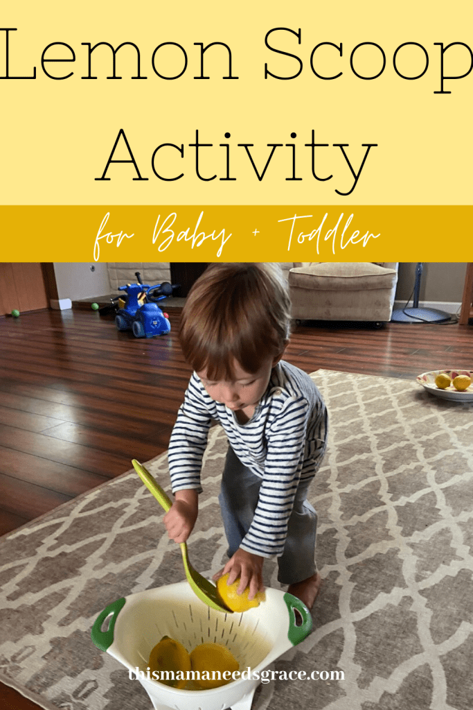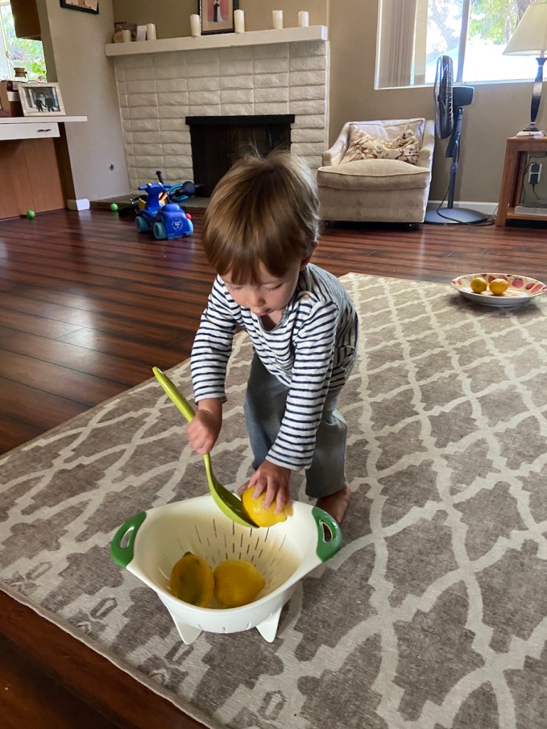 Before we squeezed more lemons for the lemon bars, we made a fun game out of the remaining lemons. This Lemon Scoop Game is SO simple and H literally had the best time. I simply but a bowl of lemons on one side and an empty bowl on the other side. I gave him a big serving spoon and had him scoop the lemons and race them over to the empty bowl. I made it feel like a race and said on your mark, get set, go! Everytime he got all the lemons into the bowl, I cheered and he got super excited and asked for more.