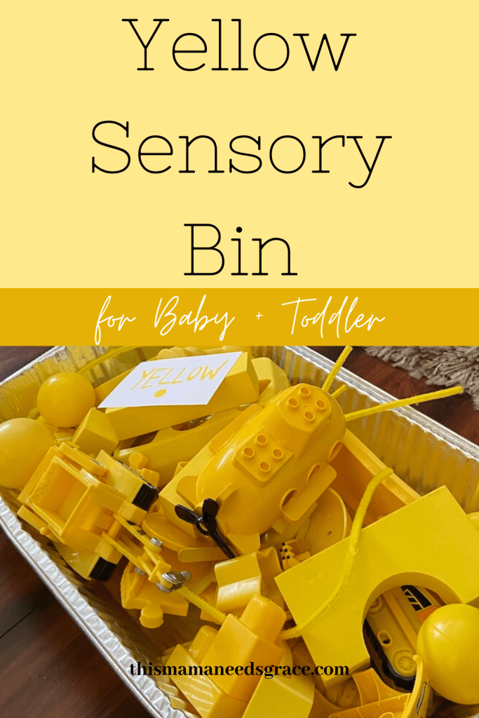 I have noticed that H has not been very interested in playing with the bin throughout the week, but I still think creating the bin with him is a great way to teach a specific color. This week I included him in the process of helping mama find all the yellow things in our playroom. He seemed to really enjoy this!