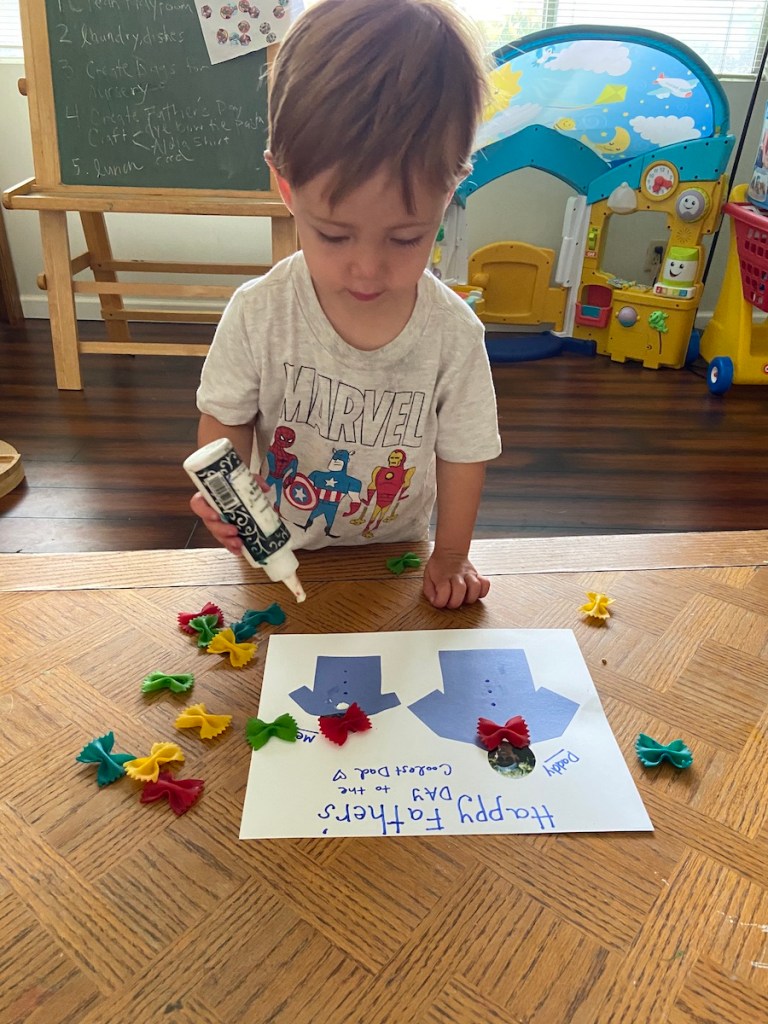 Once he was over the pasta, I let him choose the bowtie he wanted to give to dad and himself. He chose red and so then he found the matching red bowtie and placed it on his shirt. I helped him glue the pasta on the shirt. Then, he decorated the shirts with glue and glitter.
