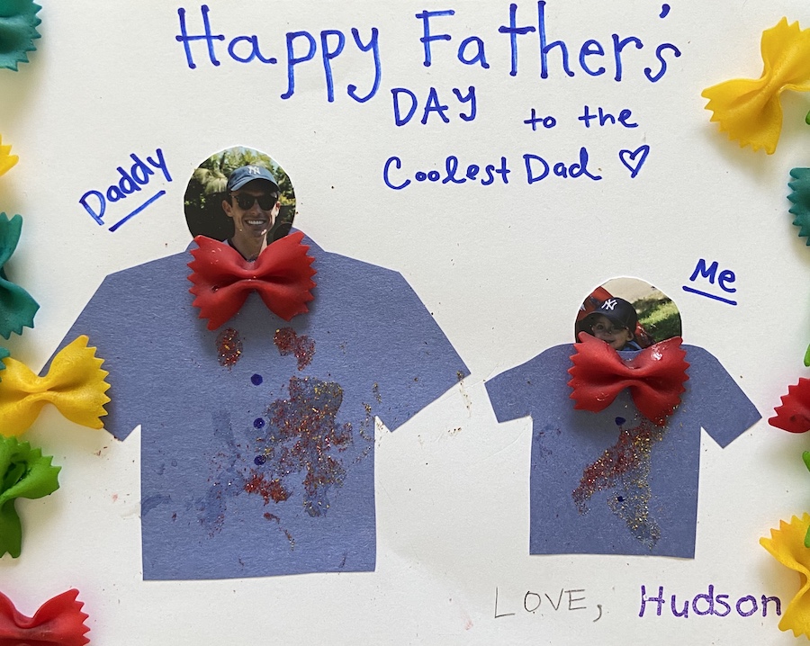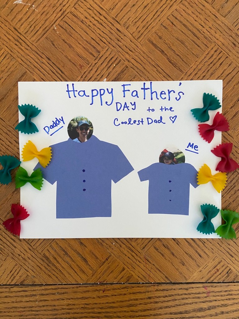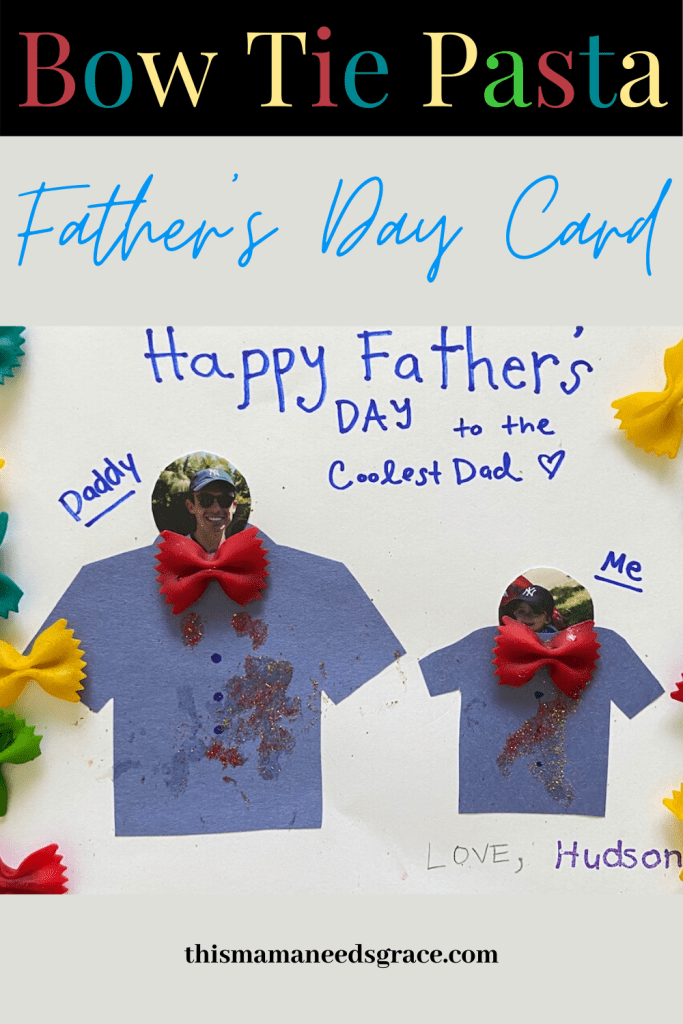 This was super simple, but the perfect card! I love how it incorporates a matching photo of my husband and son (they are both wearing Yankee baseball caps!). The red bow tie pasta is also a really fun and unique touch.