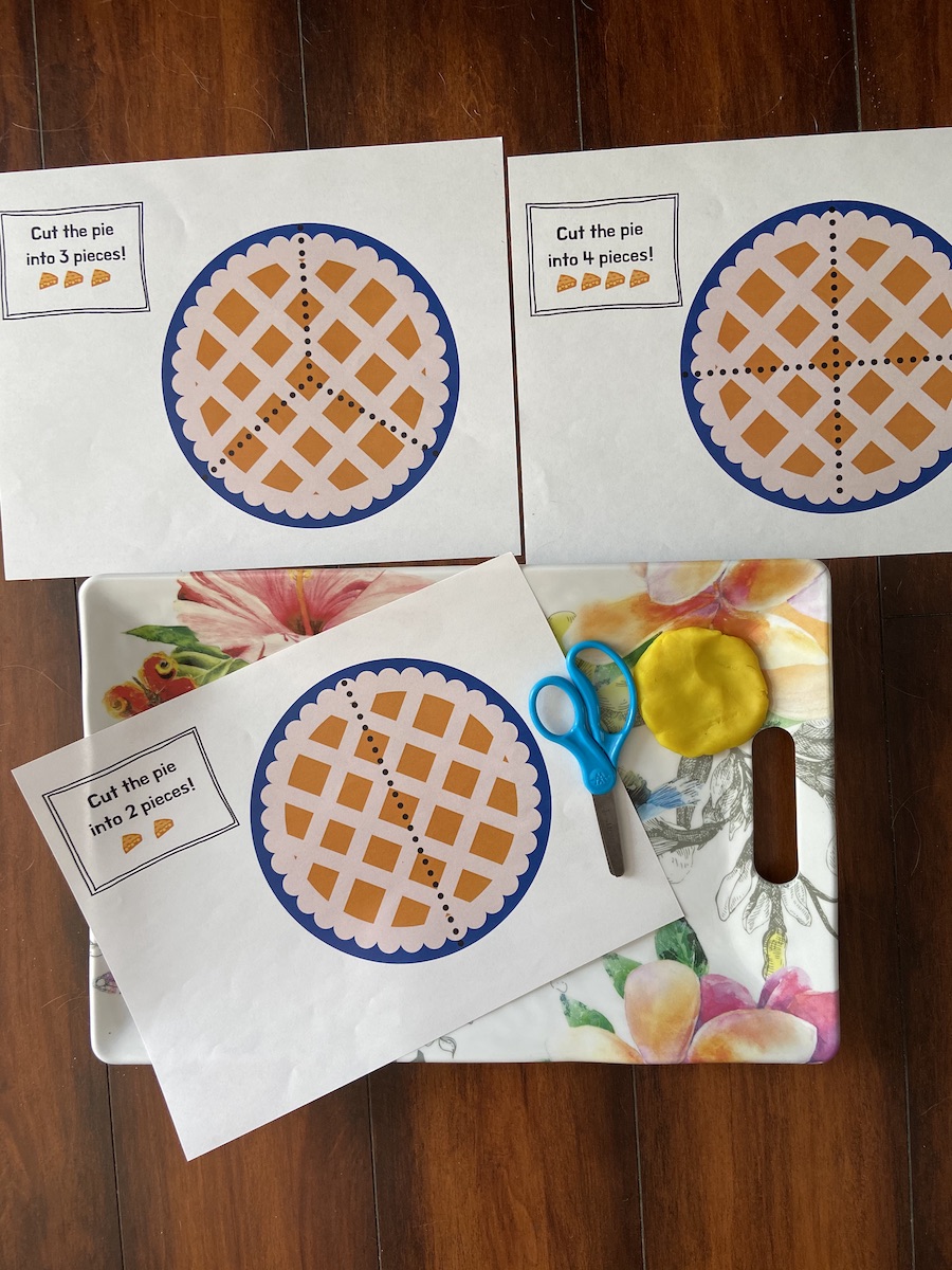 This day was all about apple pie! In the morning, I set up a really simple scissor cutting practice tray. These apple pie printables are a fun way to practice scissor cutting skills and work on understanding parts of a whole. This was a bit advanced for my 2-year-old, but would be perfect for your 3-4 year-old. We focused on working with scissors to cut our pretend apple pie made of play-dough.