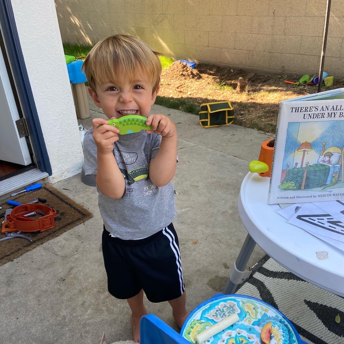 In the afternoon, after Hudson’s nap, I set up an outdoor classroom for him since it was so hot in our house. We read There’s An Alligator Under My Bed by Mercer Mayer.  This is a new favorite book of ours and is perfect for the letter A week.  During this particular read-aloud, I really emphasized the word alligator and had H point to the alligator on each page. He was really into it.  The counting part of the lesson, he was not as into, but this will take time. He is only 2!  We kept it light and fun as we worked on our counting skills from 1-5.  Again, you can get these “How Many Alligators Are Under My Bed?” counting mats for FREE when you download my Letter A Week Curriculum