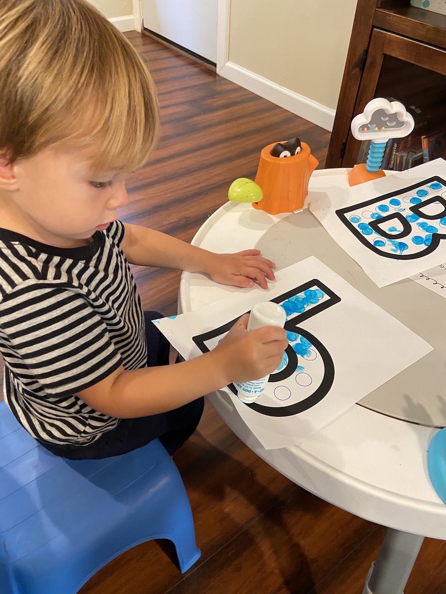 After listening to the read-aloud version of Blueberries for Sal on Youtube, we did a couple blueberry-themed learning activities. I brought out the Do-A-Dot markers for the first time in awhile and H was very into it. These are one of my favorite art supplies. It is active and Hudson gets really into stamping the paper, but it never creates much of a mess, which I love! I created a B and b for him to dot to work on letter recognition. This printable is included in the B week curriculum!