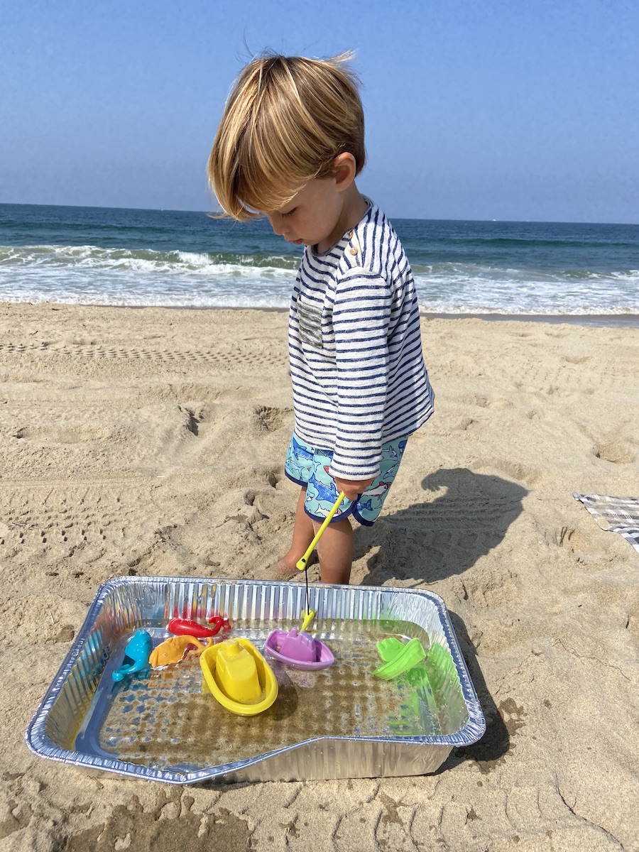I also set up a little boat sensory bin. I brought an aluminum tray, filled it with ocean water, and put in a few boats. This was a great invitation-to-play.