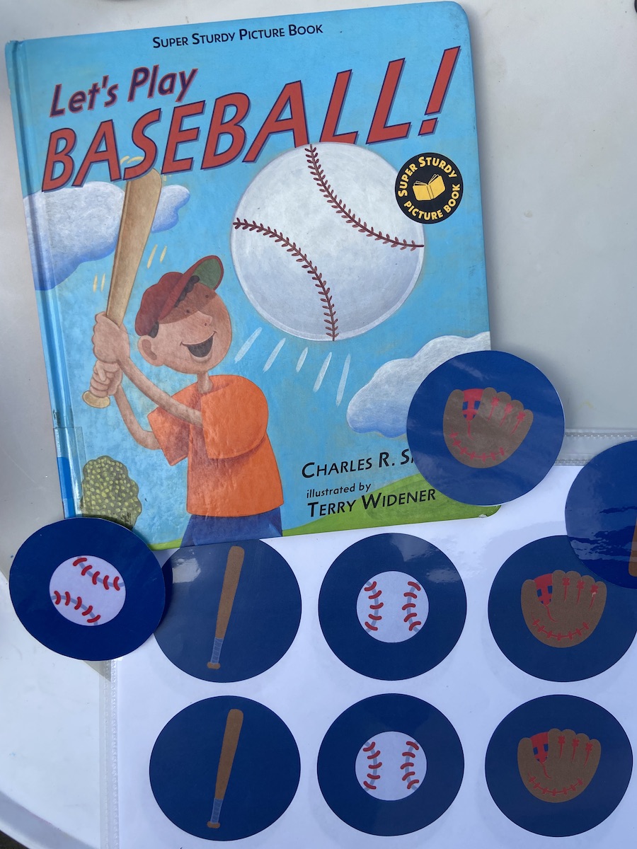 If you know H, you know one of his very favorite things is playing baseball. We had to incorporate some baseball-themed learning this week! We read Let’s Play Baseball, which quickly became a favorite of his. I used the baseball pattern building cards from this week’s curriculum. I made a few extra copies to put in plastic sleeves to show him the pattern. The other copies, I printed, laminated and cut out. This is a fun way to work on matching skills, sorting skills, and pattern building. This felt a bit too advanced for H, but I will definitely bring these out again in a few weeks!
