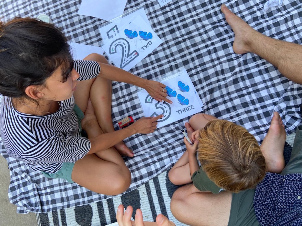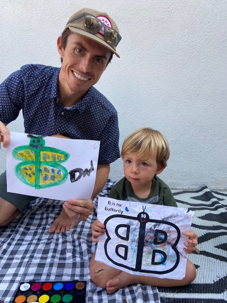 After some counting, Hudson enjoyed some watercoloring! Mom and dad painted our own butterflies, while Hudson used the B-winged butterfly that is included in the curriculum! This final lesson of the week was the perfect one to do as a family. While it can be difficult to get the whole family together for learning time, I noticed that H was much more involved and interested in the lesson with dad being involved!