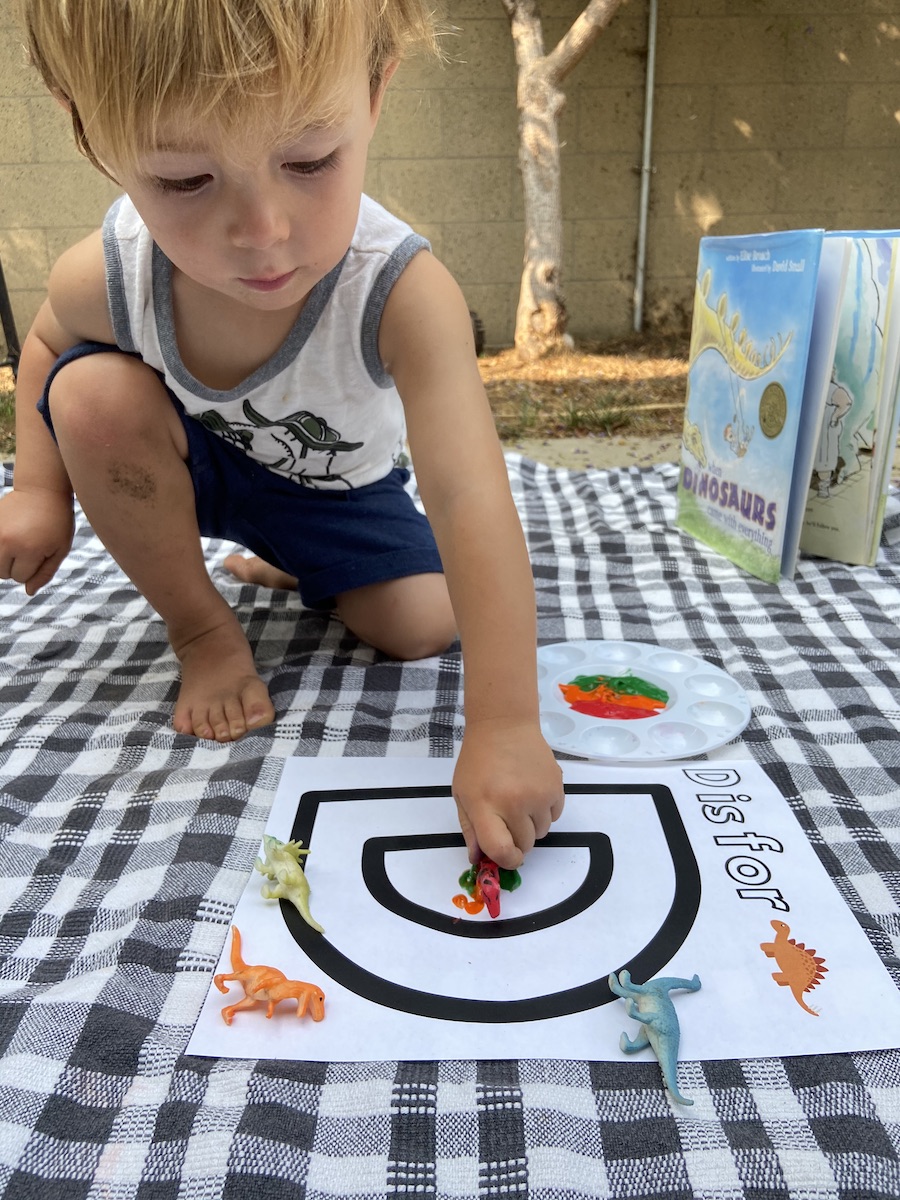 For the letter D in the alphabet book we are working on, I setup some paint and small dinosaurs for him to make dino tracks on the letter. This is usually an activity H would love, but this afternoon he was not as interested. So he did a few marks and then quickly moved on to playing in the dirt with his dump trucks!