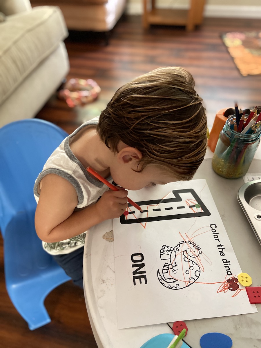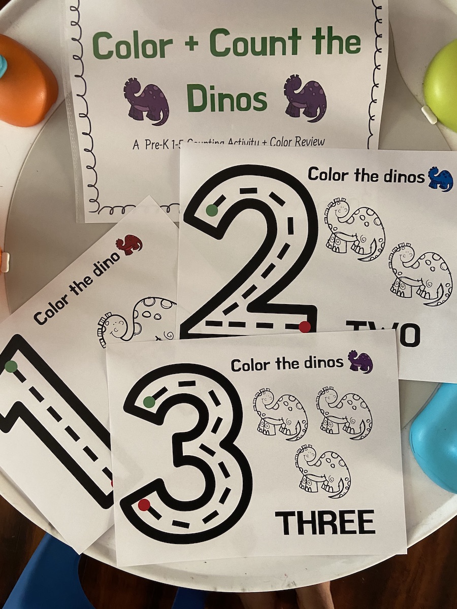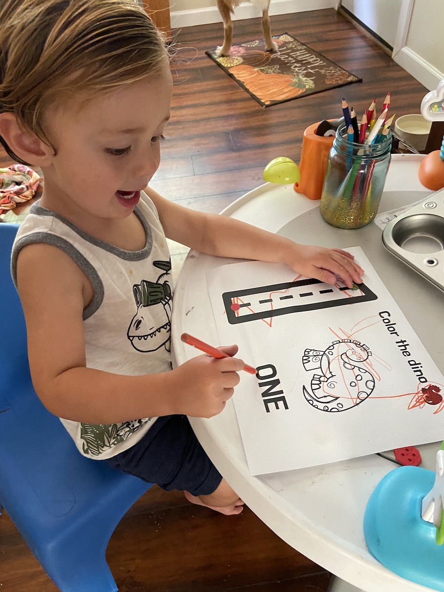 There are so many good dinosaur books out there, but for this activity, we read When Dinosaurs Came With Everything. This is a great story, super fun, and amazing illustrations. We both enjoyed it. After reading through a couple times, we did a couple themed dinosaur activities. We did the “Color and Count Dino” activity from my curriculum. These are similar to my previous counting mats, but I added a coloring element. This is great for early counting exposure and for continuing to review colors. H is still very much a scribbler, but having smaller dinosaurs to color gave him a bit more focus and target while coloring. Every week he seems to be a little more invested in these counting activities, which makes his mama happy.