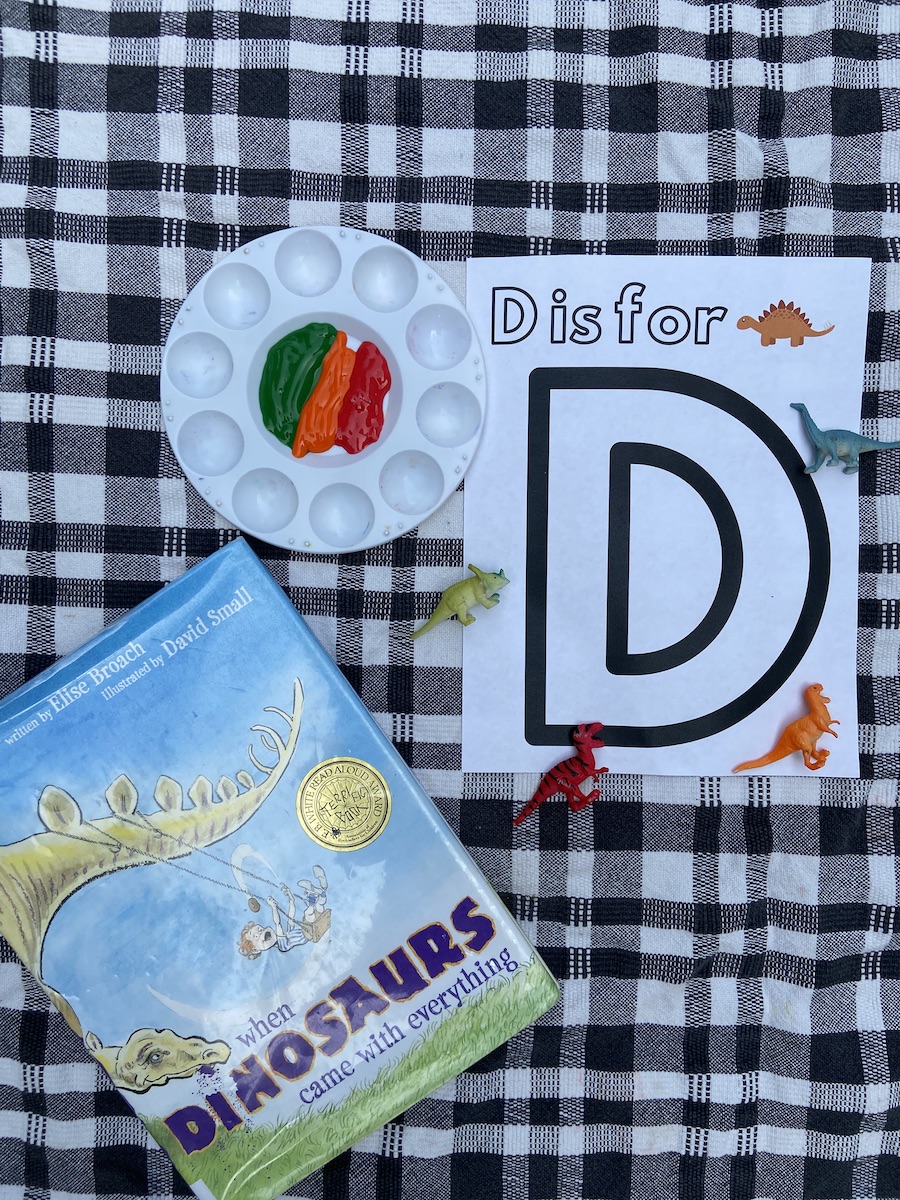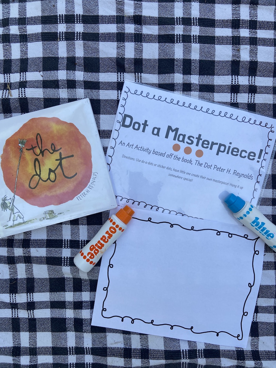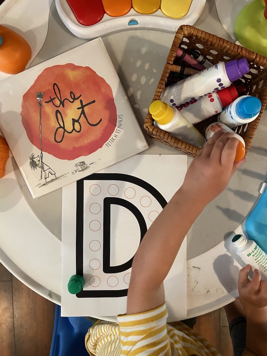 There so many fun dot-related activities to pair with this book. We did a do-a-dot for the letter Dd and I gave him a printable to create his own masterpiece. I put out watercolors, crayons, and do-a-dots and let him be creative with this open-ended activity.