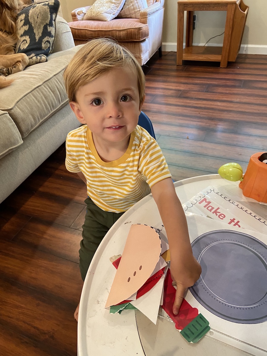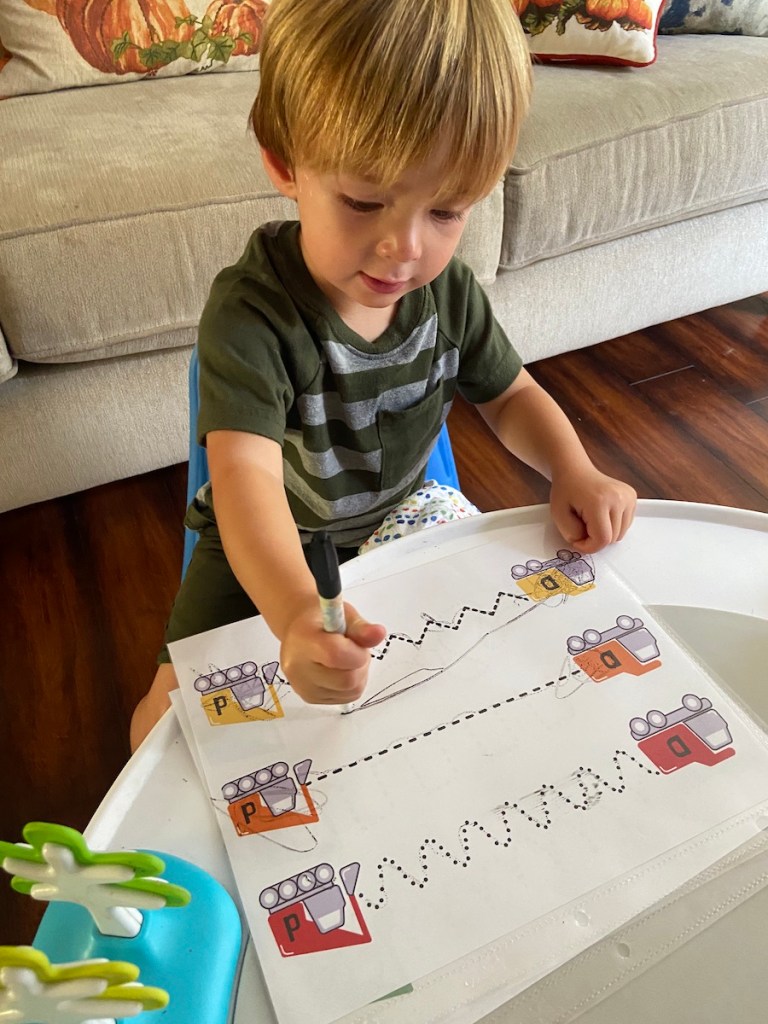 For the activity, we did the dumper to digger tracing line practice I created. This is one of the activities included in the Letter D Curriculum. H is 27-months and tracing lines is a bit advanced, but it is still great early exposure. I model what it looks like to trace the lines. And we did a few lines together. I let him try on his own after a fair amount of modeling and he did a lot of scribbling, but did a pretty good straight line. This is all just for fun, but I do think this early practice will help him in the next year when we focus on this skill more!