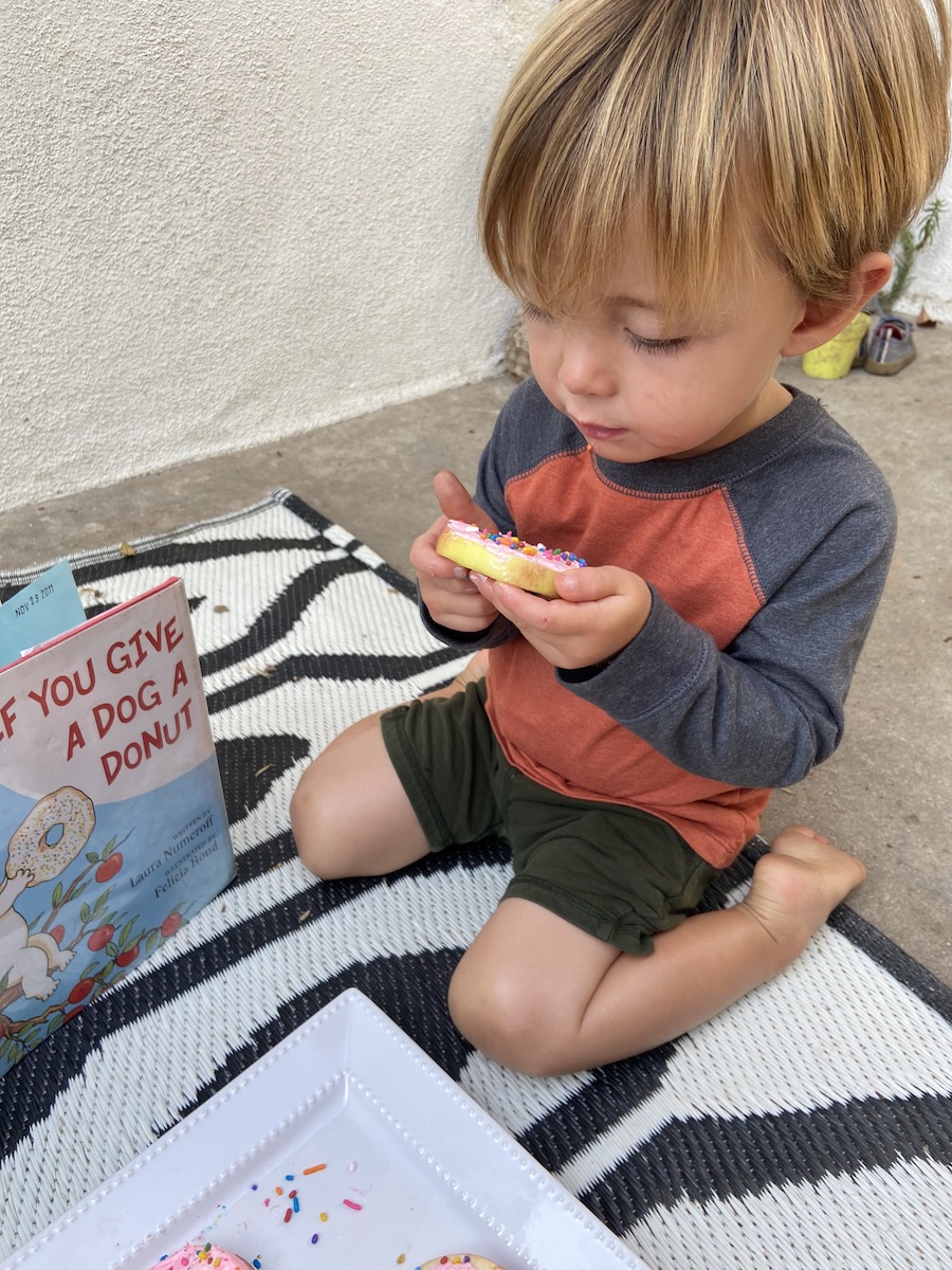 We started our donut-themed day, with a late morning snack of “healthy donuts.” Instead of fried dough, think apple slices, and instead of sugary frosting, thinking pink cream cheese with sprinkles on top! These turned out yummy and H was totally obsessed with them. I felt so much better with him snacking on these donuts over real ones. To H, as long as there are real sprinkles, these treats are just as good as the real thing.