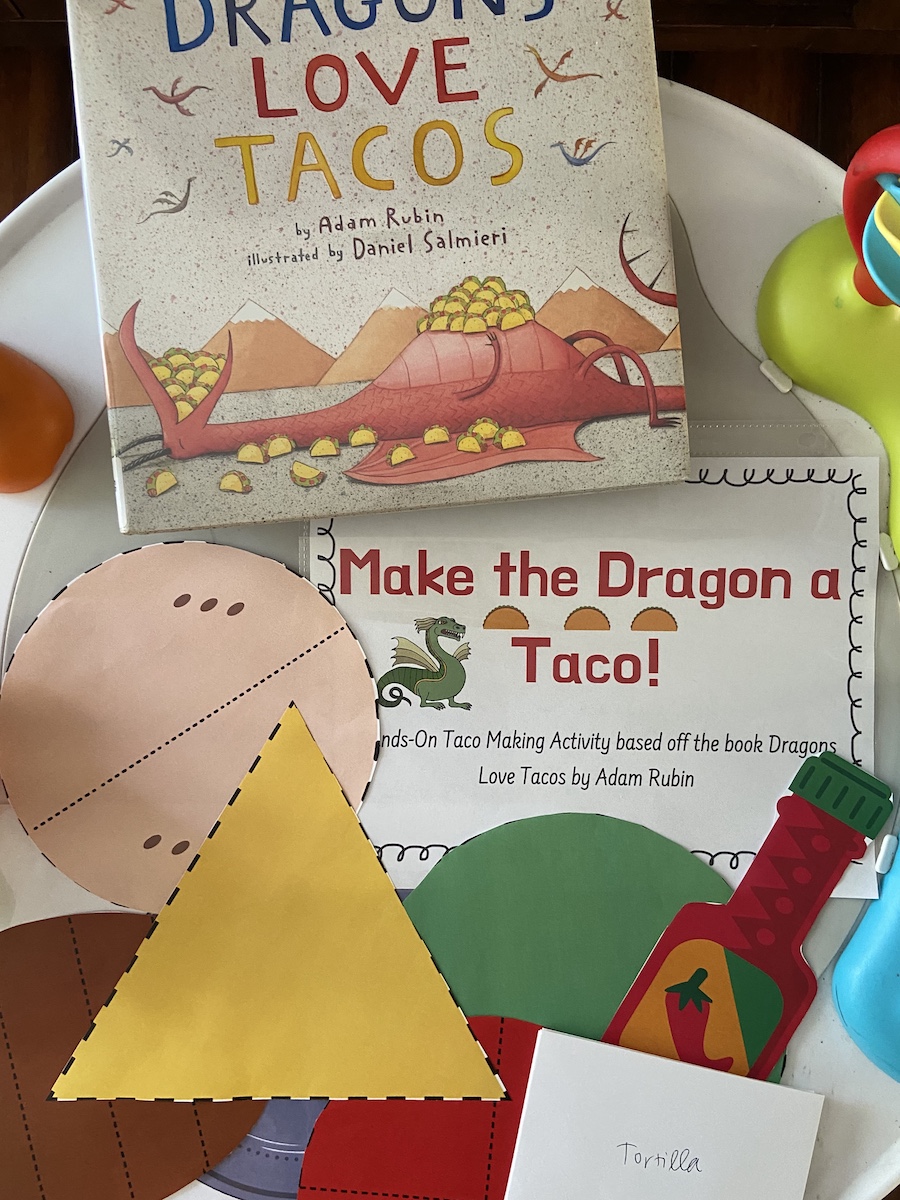 We read Dragons Love Tacos, which was the favorite of the week. We definitely read this book the most out of all of them! The activity I designed to pair with this book, really works on fine motor skills (folding, cutting, tearing). Using the printables included in “Make a Dragon a Taco” activity, simply cut out the tortilla, tomato, lettuce, cheese, beef, and hot sauce. To make this activity even more interactive, I also cut out the instructions for each one and put it in a separate envelope. This allowed for H to get the chance to open 6 different envelopes, which increased his overall excitement and engagement towards the activity. We worked on folding skills (tortilla), cutting skills (tomato and beef), and tearing paper skills (lettuce and cheese). Some of these skills are still tough for H, but he really enjoyed the concept of pretending to make food and even enjoyed pretending to feed it to the dragon! This is a fun, hands-on activity, that really encourages imagination and creativity!