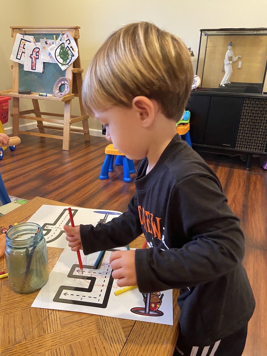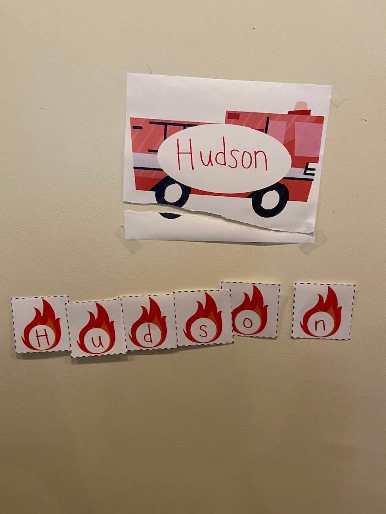 This week of curriculum also included some name recognition practice! This is a skill I have not focused on much with H, but is something I want to work on and get him to recognize by the end of the school year! For this activity, I wrote his name on the fire truck template. I then wrote each individual letter on the fire templates. I laminated these and cut them out. I hid them around the house and had H look for them and bring them to the truck. It was fun! While he was not super into ordering them to match his name on the truck, this is a great start to getting him to recognize the letters in his name. Not to mention, name recognition is a great way to get your little one to learn the alphabet.