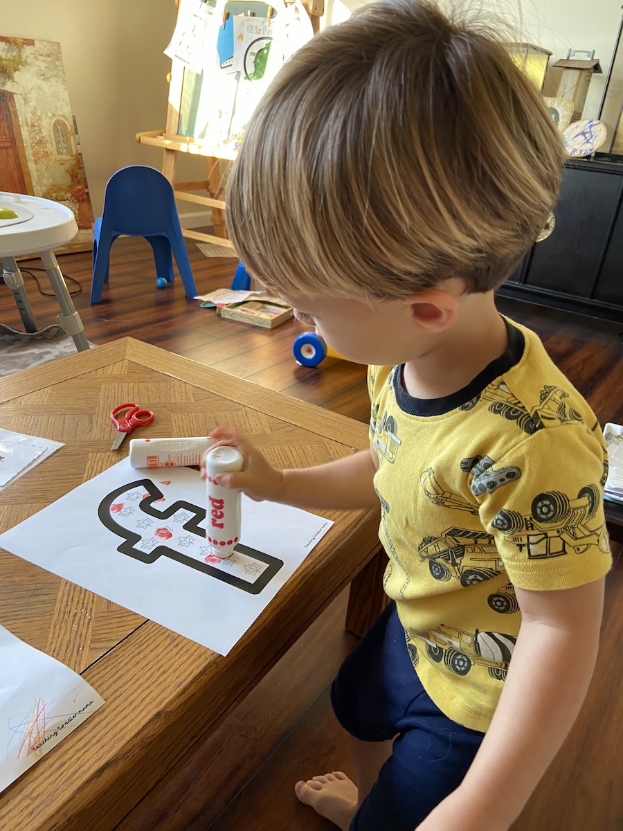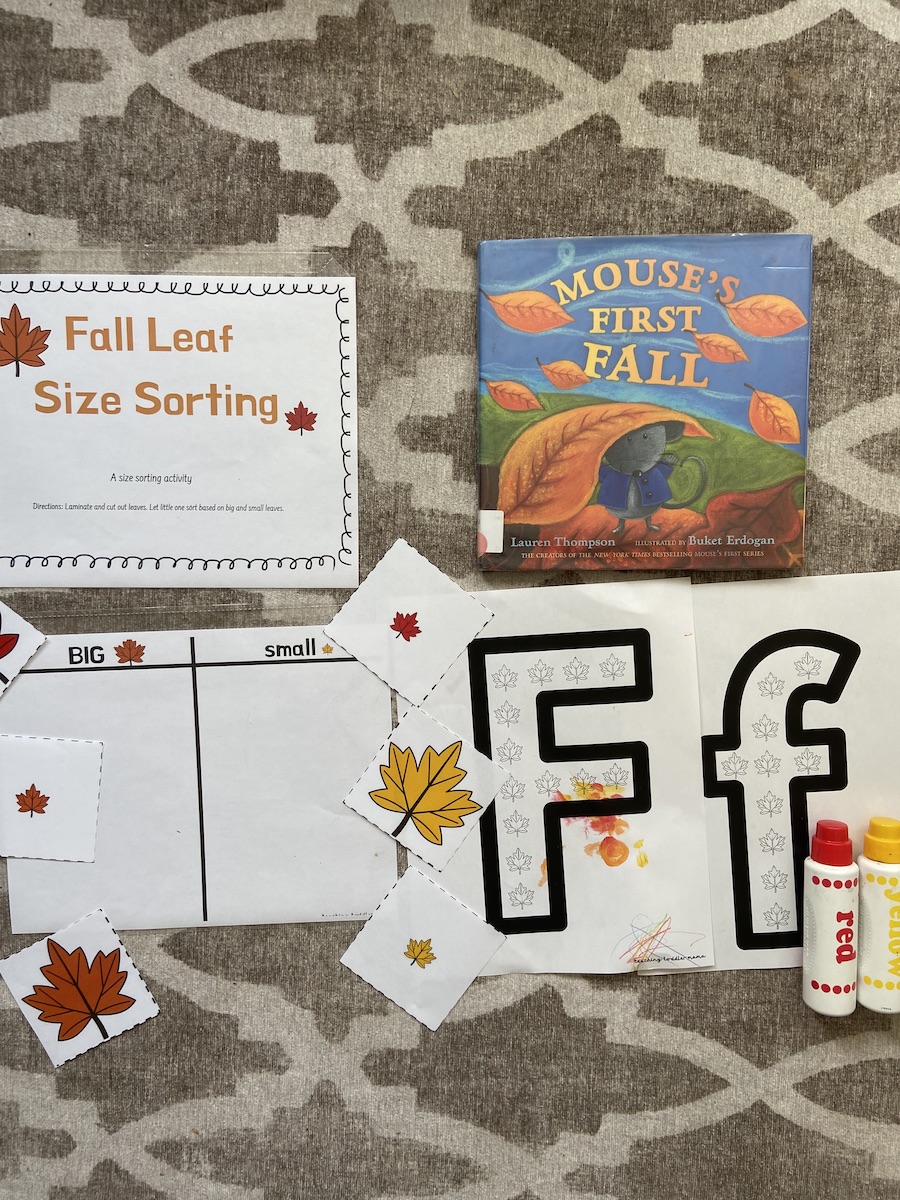The perfect time of year to do fall-related activities for the letter F. The curriculum includes some leaf size sorting and a fall leaf do-a-dot. For do-a-dot letters, I have been enjoying using other objects besides dots. This is a fun way to mix up the ordinary do-a-dot and makes it more tied to a specific theme.