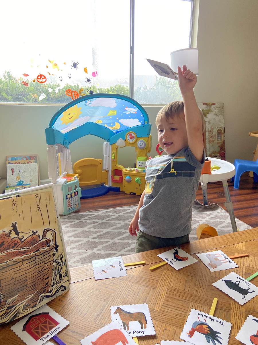 This week, we visited Underwood Family Farms. We got to see all the pumpkins, ride on a wagon, and see lots of farm animals! H loved seeing all the animals, especially the pigs and chickens. To pair with this field trip, we read the book On the Farm (which is pretty simple, but H really loved it). In the curriculum, there are farm animal puppets that match with all the animals in the book. I laminated them and attached a popsicle stick. I spread them out and as we read the book, I had H pick up the correlating animal. It turned out to be a fun and engaging way to read the story. Also, great for imaginative play.