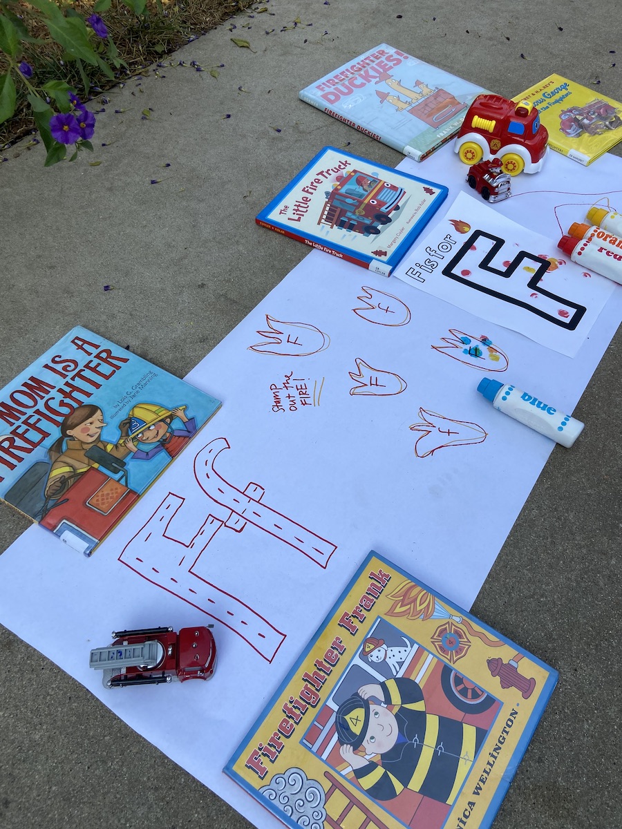 In the middle of the week, I set up an activity mat that was firefighter-themed. These are super simple to setup and make for a great activity that offers variety and options. Tracing is still tough for H, but he has been enjoying using cars/trucks to follow the dotted line. This is a great way to work on beginning tracing skills! These activity mats are also perfect for displaying a few themed book options. We checked out SO many awesome firefighter books from the library. The favorites were definitely My Mom is a Firefighter and Curious George and the Firefighters.
