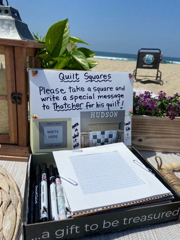 Oh! And one other detail from this sprinkle that was similar to my baby shower with Hudson is that my mom ordered these quilt squares from Etsy. All the guests were able to write a message to baby Thatcher. My mom will send back all the squares and the seller on Etsy will then make it into a quilt! Hudson’s quilt is still always on his bed. It is a great keepsake and a fun and lasting way to remember the people that made the day special.