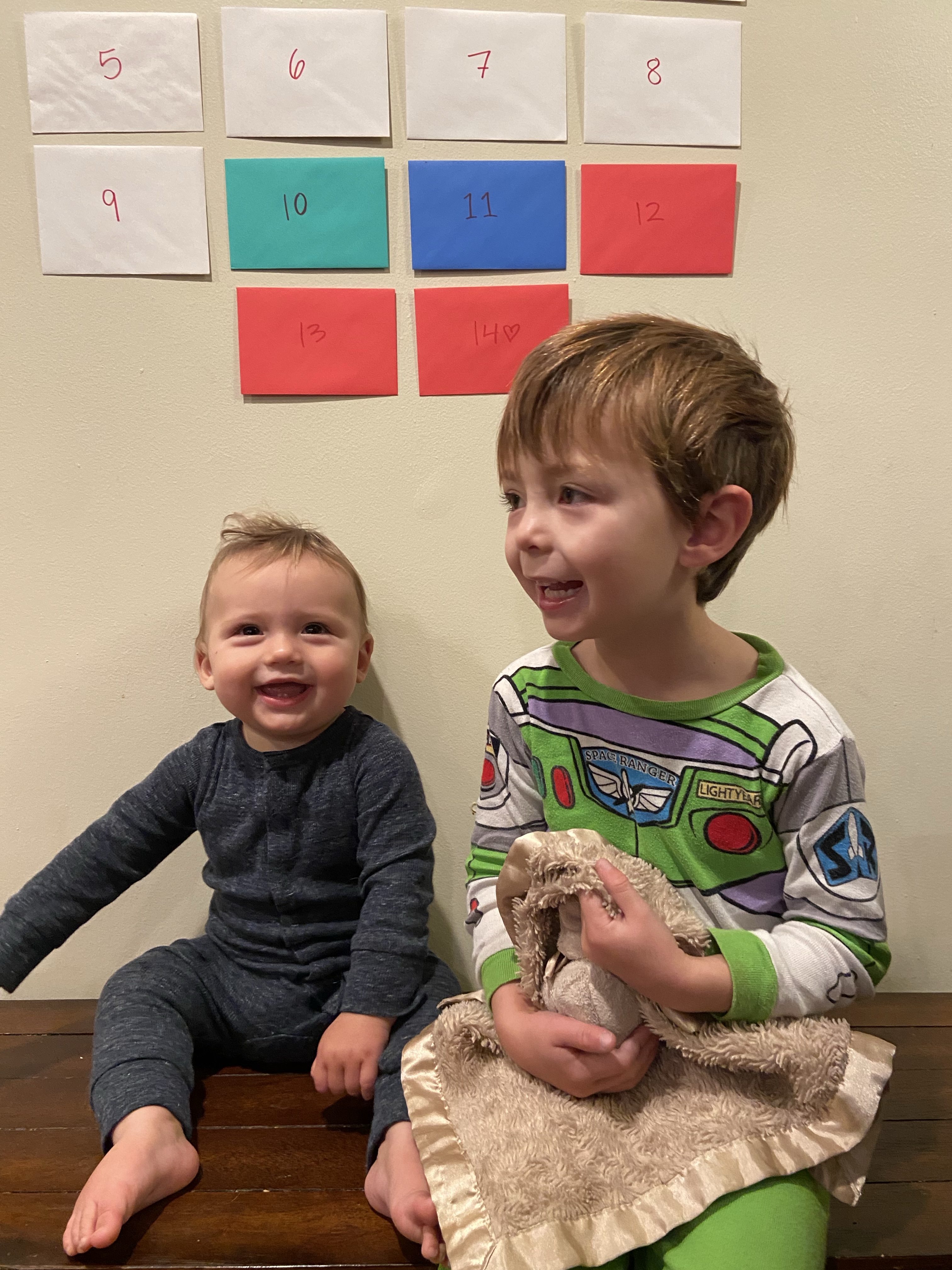 On the last day of January, I write out 14 love letters to our boys. I keep it short and simple but for each day leading up to Valentine’s Day they have a letter to read that tells them one thing we love about them! I stick them up on the wall and H opens it every morning. It is a fun thing for H to look forward to! I think hearing specific things we love about him is a good heart fill up for him too!