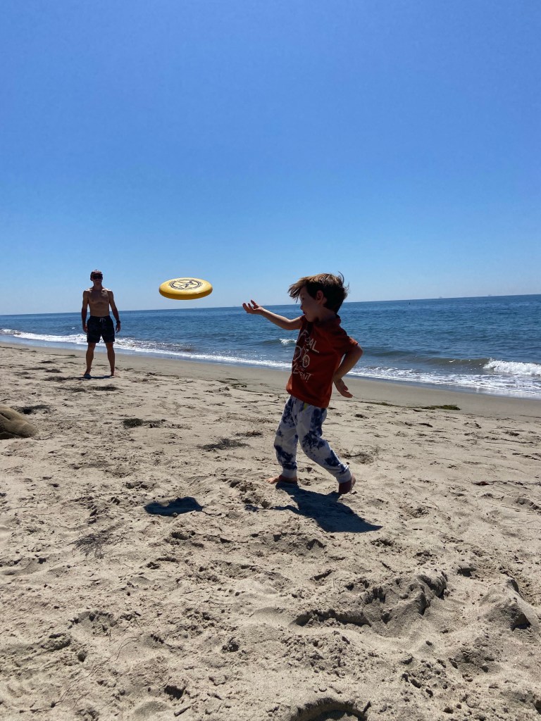 After some play time at the playground, we drove to Butterfly Beach in Montecito. We were hoping to just walk to El Capitan State Beach, but from our cabin it would have been a mile walk. We decided to drive to this beach instead and it was perfect with the boys. We literally were able to park our car, step onto the sand, and plop all of our things down. This is the most accessible beach with kids I have ever been to. We even watched one mom with three kiddos manage to park and get everything situated just by stepping outside of her car. We all went into the water and Lance even took Hudson out on his surfboard. Hudson even kind of caught a wave. He also crashed head first, but was happy to be “surfing.” We all walked along this beach. It was really beautiful and felt more like a European beach (I don’t really know since I haven’t traveled much, but it felt like it). Hudson also has become strangely good at throwing a frisbee.