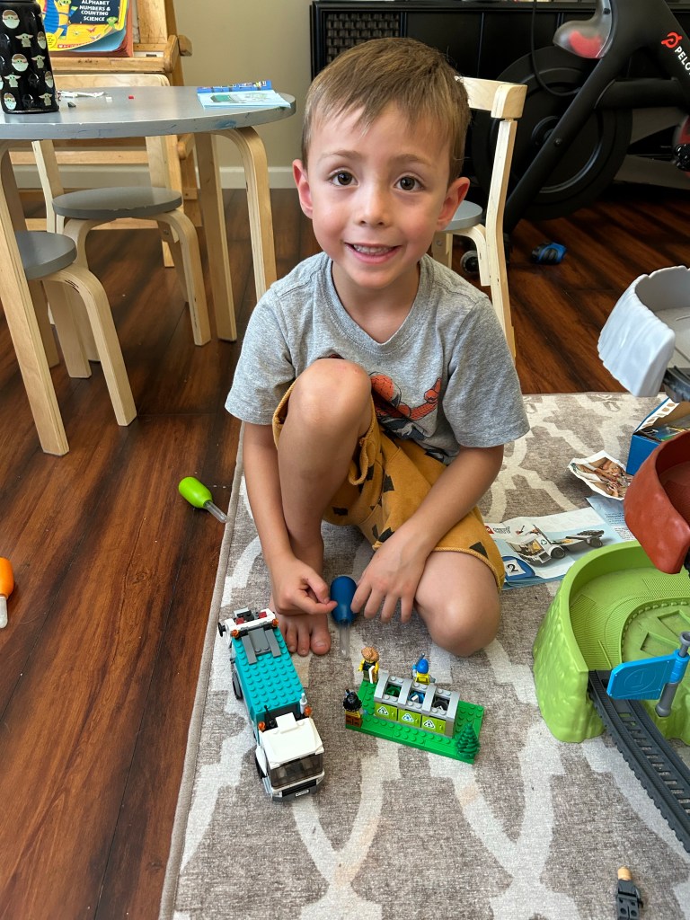 At the start of summer, we got this Scholastic Kindergarten prep workbook from Costco (you can also purchase it on Amazon here). We did a small amount of work in it every few days. It was not a thing we ever spent more than 15 minutes on and there were days we definitely skipped it all together! It was a nice way to give some structure to our summer mornings and keep some of his letter and number skills sharp. I also incentivized him by telling him if he worked on it consistently throughout summer, he could pick out a small Lego set. Legos are the best motivation for this kid.