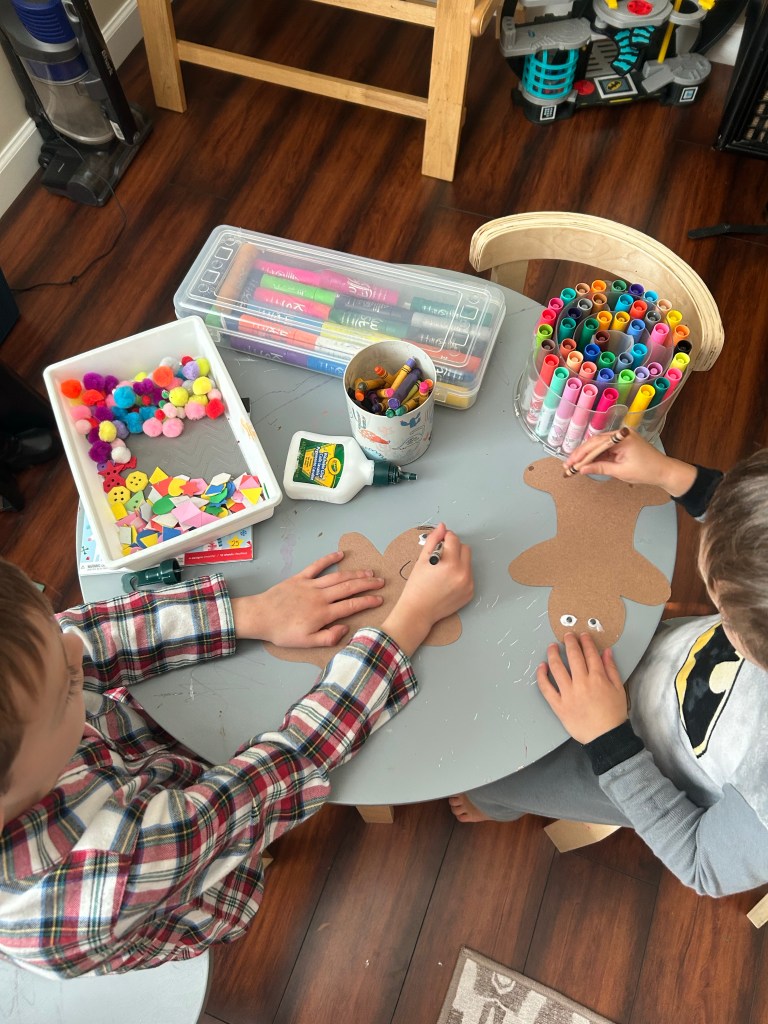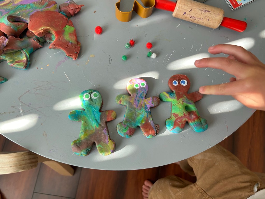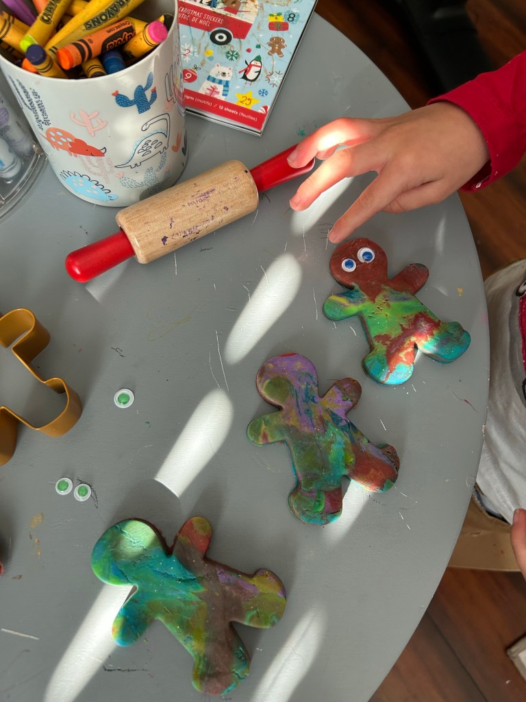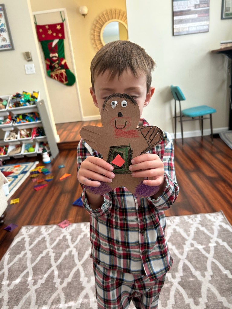 I have not had the energy to do a bunch of Christmas crafts or make gingerbread play-dough likely I usually would, but we made do with what we had on hand. I cut out gingerbread men out of brown construction paper and let boys decorate with materials we had on hand (big hit!). We still made gingerbread men out of play dough too but just used colorful store bought dough instead.