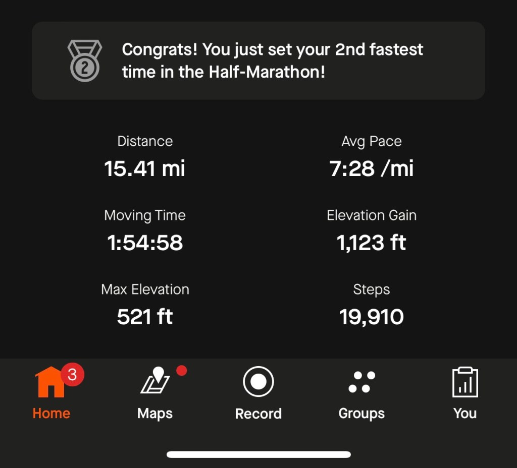 Long Run: 15 miles @ 7:41 pace. My map on Strava showed I went even faster, but not sure which one is most accurate. This was definitely my strongest long run so far. Again ran in PV, so feeling good with the amount of elevation gain I’m getting in with these longer runs. Hoping it will help with all the hills in NYC.
